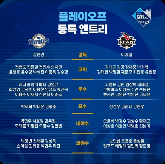 2023 프로야구 KBO 포스트시즌 플레이오프 라인업이 발표되었습니다. 각 팀마다 감독, 코치를 제외한 30명에 해당하는 라인업을 제출하였습니다.