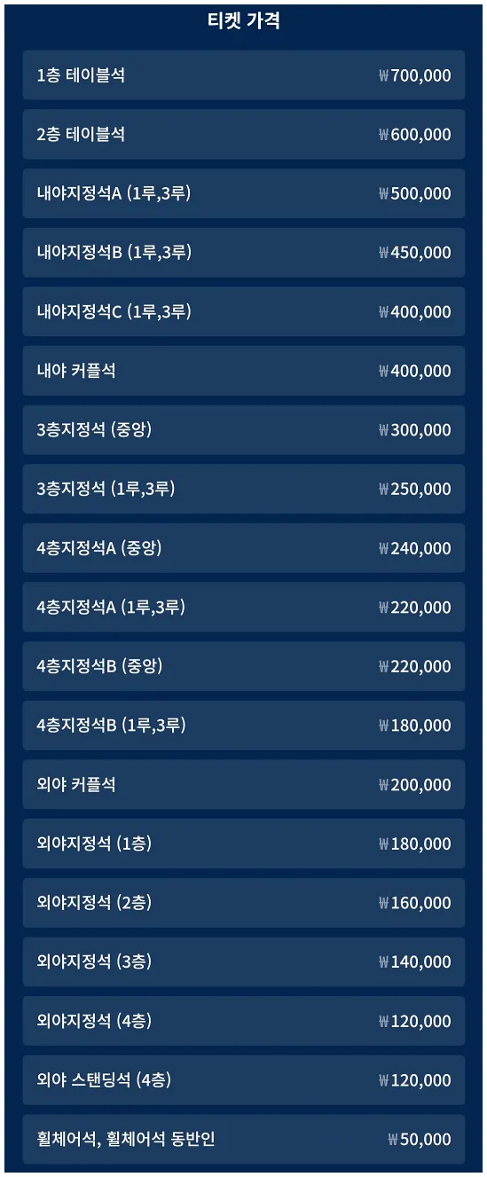 | 내야 커플석 | 40 만원 | 3층 지정석(중앙) | 30 만원 | 3층 지정석(1루, 3루) | 25 만원 |
