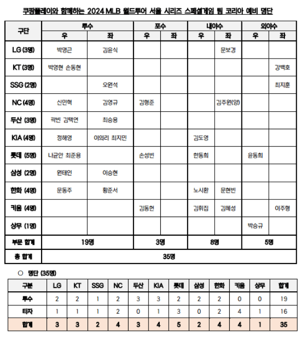 쿠팡플레이와 함께하는 2024 MLB 월드투어 서울 시리즈 스페셜게임의 팀 코리아 라인업 명단을 발표하였습니다.